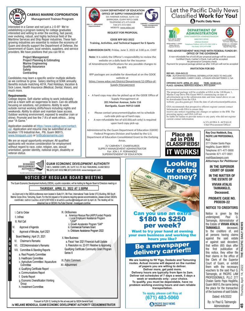 The Guam Department of Education (GDOE) invites interested parties to respond to this Request for Proposal (RFP) for High Risk Consultant.